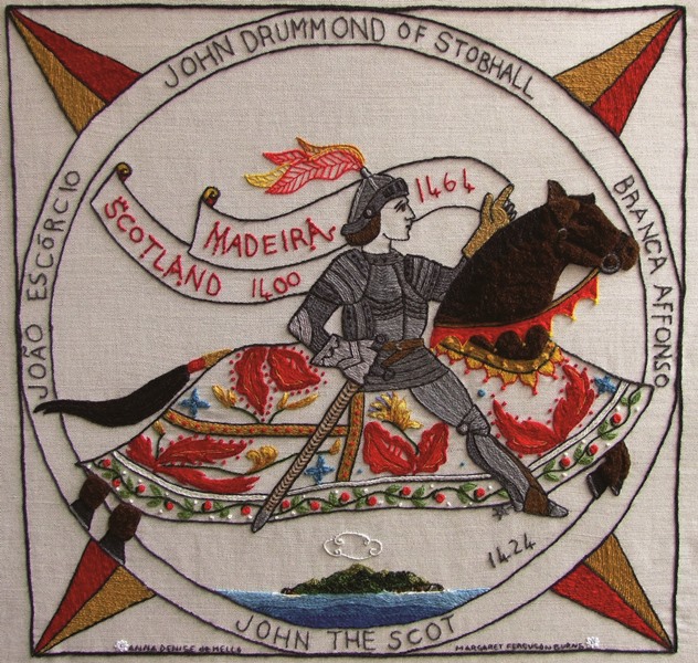 The progenitor of the Portuguese line, known in 15th-century Madeiran records as João Escórcio (‘John the Scot’), was identified by his descendants and the Scottish Chiefs as John Drummond. According to family tradition, Escórcio revealed his true identity as the son of Sir John Drummond of Stobhall and Cargill, Chief of the Clan Drummond, and Lady Elizabeth Sinclair during a deathbed confession. This parentage placed the Portuguese branch in the direct line of the Scottish Chiefs and established a royal connection, as Sir John Drummond was the brother of Anabella Drummond, Queen of Scotland.